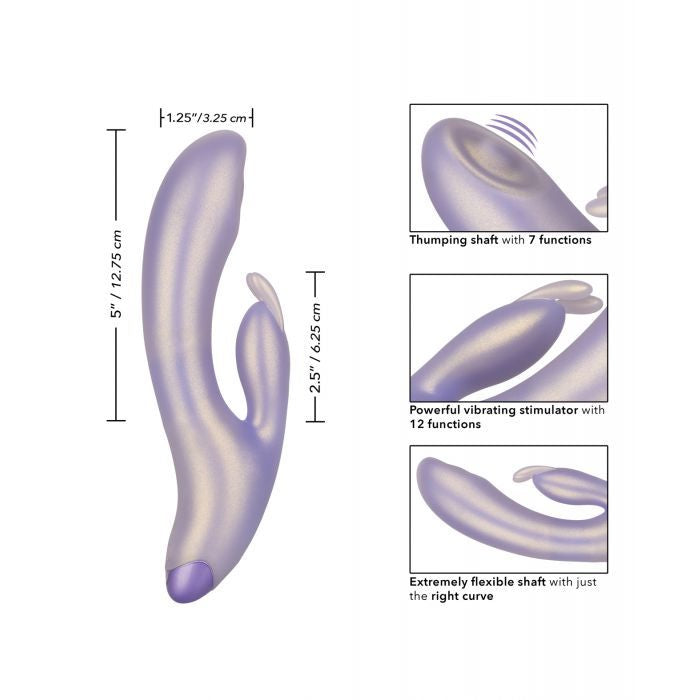 The gorgeous G-Love™ G-Bunny is a dual stimulating massager with vibrating shaft and thumping pulsation stimulator. Love yourself just right with the flexible G shaft, 7 independent functions of thumping action and 12 independent functions of vibrations. The sensually curved thumping shaft and flickering rabbit stimulator are perfect for teasing internal and external sweet spots. For an ultra smooth surface and flexible body, the flickering stimulator and massager are covered in a shimmering Silicone. This silky smooth vibrator is packed with 12 functions of vibration and 7 independent functions of thumping stimulation made just for you. The high tech memory chip remembers just how you like it resumes play on the last function used. Whether you’re taking a dip with a lover or indulging in a steamy solo session, look forward to up to 1 hour of waterproof vibration. Recharge pleasure and get back to playtime in only 2 hours with the provided USB cable. The flexible massager is made from a hygienically superior silicone. This body safe material is unscented and phthalate free to keep your most sensitive spots happy and healthy. 7.5" x 1.5" / 19cm x 3.75cm (Overall). 5" x 1.25" / 12.75cm x 3.25cm (Shaft). 2.5" x 0.75" / 6.25cm x 2cm (Stimulator). One Year Warranty.