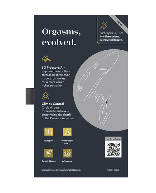 Womanizer's new flagship product with new advanced Pleasure Air Technology. 3D Pleasure Air . Designed for those looking to take their pleasure to the next level with intense multiple orgasms. Introducing our advancement in Pleasure Air Technology. 3D Pleasure Air. This cutting-edge technology features a new linear motor elevating the contactless stimulation to provide a heightened, more enriched sensation.Enhancing the customization options, our 3D Pleasure Air allows you not only to control speed (intensity levels) but also the depth of the air waves, thanks to the new Climax Control feature. We have three levels of depth control, alongside the 14 intensity levels, offering a more customizable & personalized experience than ever before.Our device reaches lower pressures than ever before, delivering a natural and deeper pleasure experience. Womanizer Next offers intense pleasure without overstimulation, and thanks to the new motor it stands out as our quietest model to date. The Womanizer Next toy comes with a USB charging cable (AC adaptor not included), quick-start guide, compliance & safety information, additional stimulation head and an #Imasturbate sticker. Warranty: 5 years.